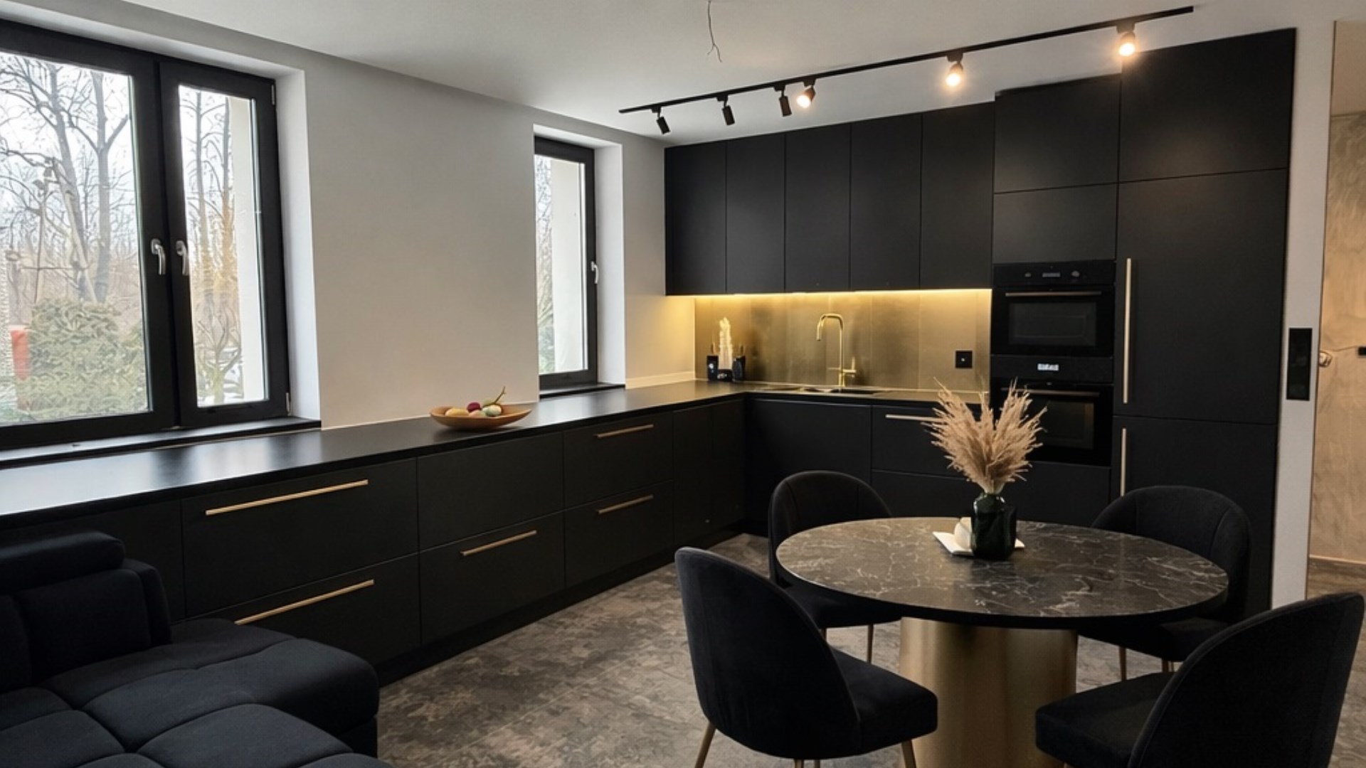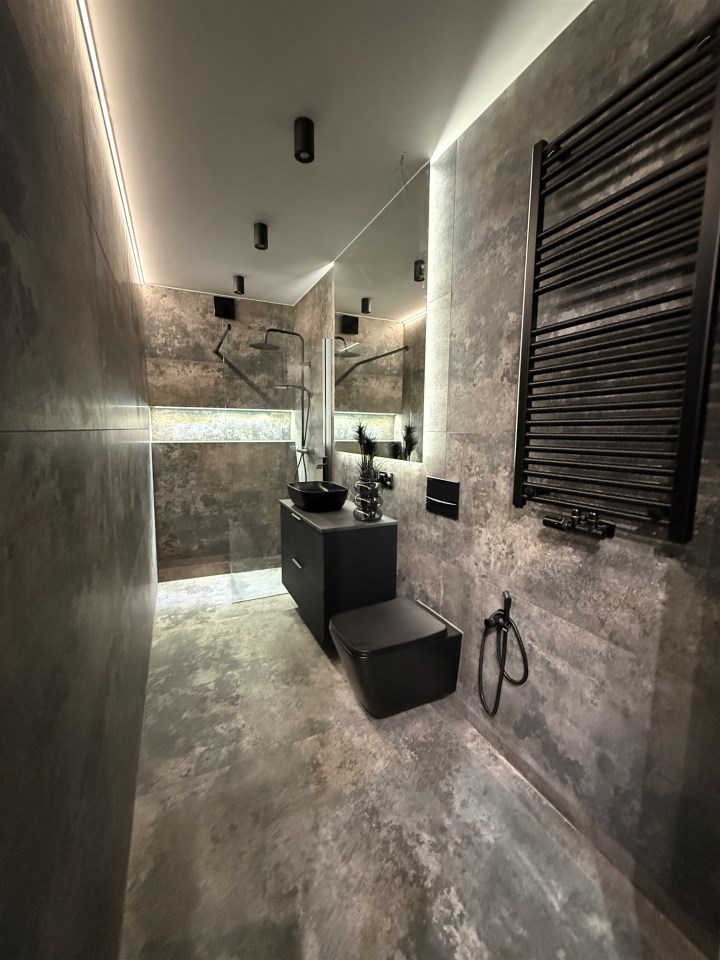Nowoczesne oświetlenie LED, ogrzewanie podłogowe gazowe w całym mieszkaniu, drzwi ukryte do sufitu, drzwi akustyczne, designerskie detale i efektowne lustra od podłogi do sufitu. Mieszkanie wymaga jedynie wykończenia podłóg w dwóch pokojach, zabudowy kuchni i umeblowania — idealna baza do aranżacji pod własny gust.